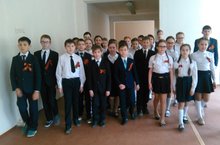 Сегодня в школе прошла акция "Георгиевская ленточка". На всех учащихся, учителях были ленточки, а дежурные по школе прикалывали ленточку всем, кто приходил в школу. В классах прошли беседы о Великой Отечественной войне.
