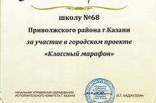22 декабря состоялась церемония закрытия городского проекта "Классный марафон", в котором принимали участие 173 школы города.От нашей школы в проекте выступал 7Б класс, командир Миннулина Зарина, классный руководитель Гаврилова В.А., который вошел в десятку лучших и былнагражден грамотой Городского управления. Молодцы! Это большая победа. Спасибо всем, кто голосовал за нас. -