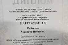 Поздравляем ученицу нашей школы Кибякову Ангелину ! Она стала призёром на заключительном этапе Республиканской олимпиады школьников по татарскому языку!