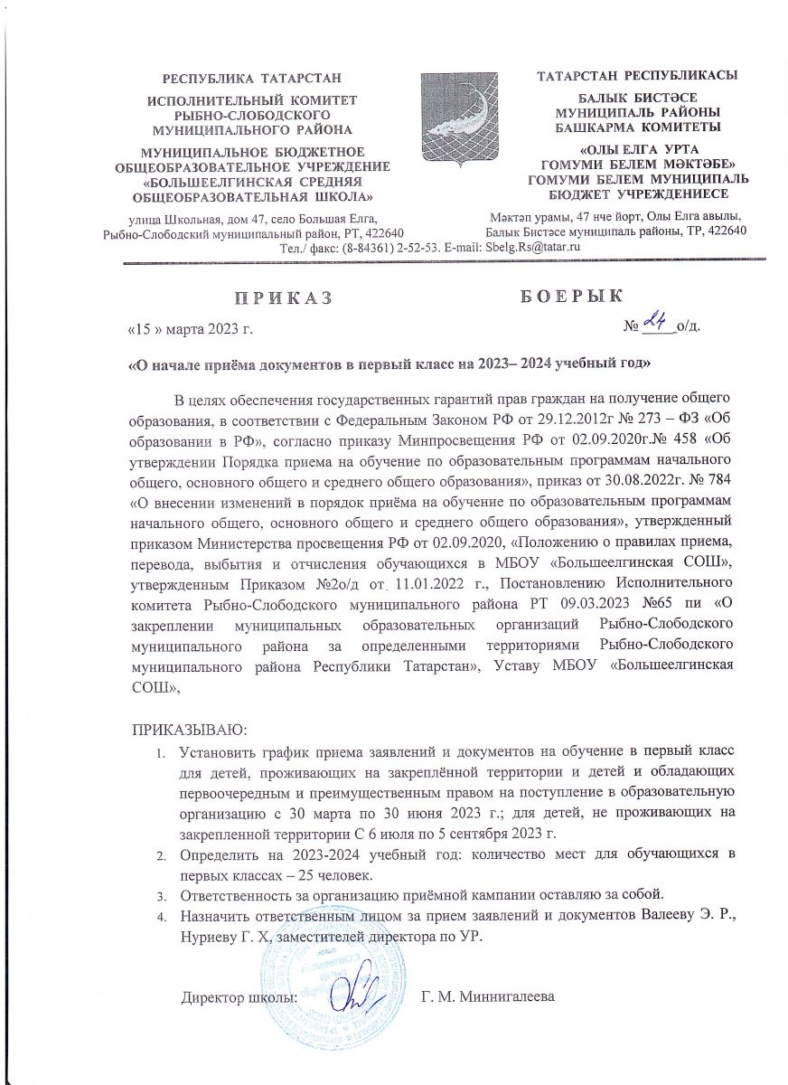 Приказ «О начале приёма документов в первый класс на 2024– 2025 учебный год»
