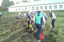 Укучылар, мәктәп бакчасында, көзге уңышны җыеп алуда катнаштылар.