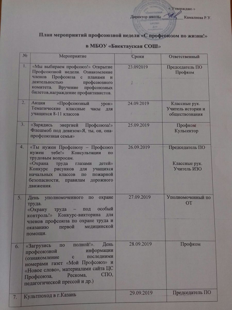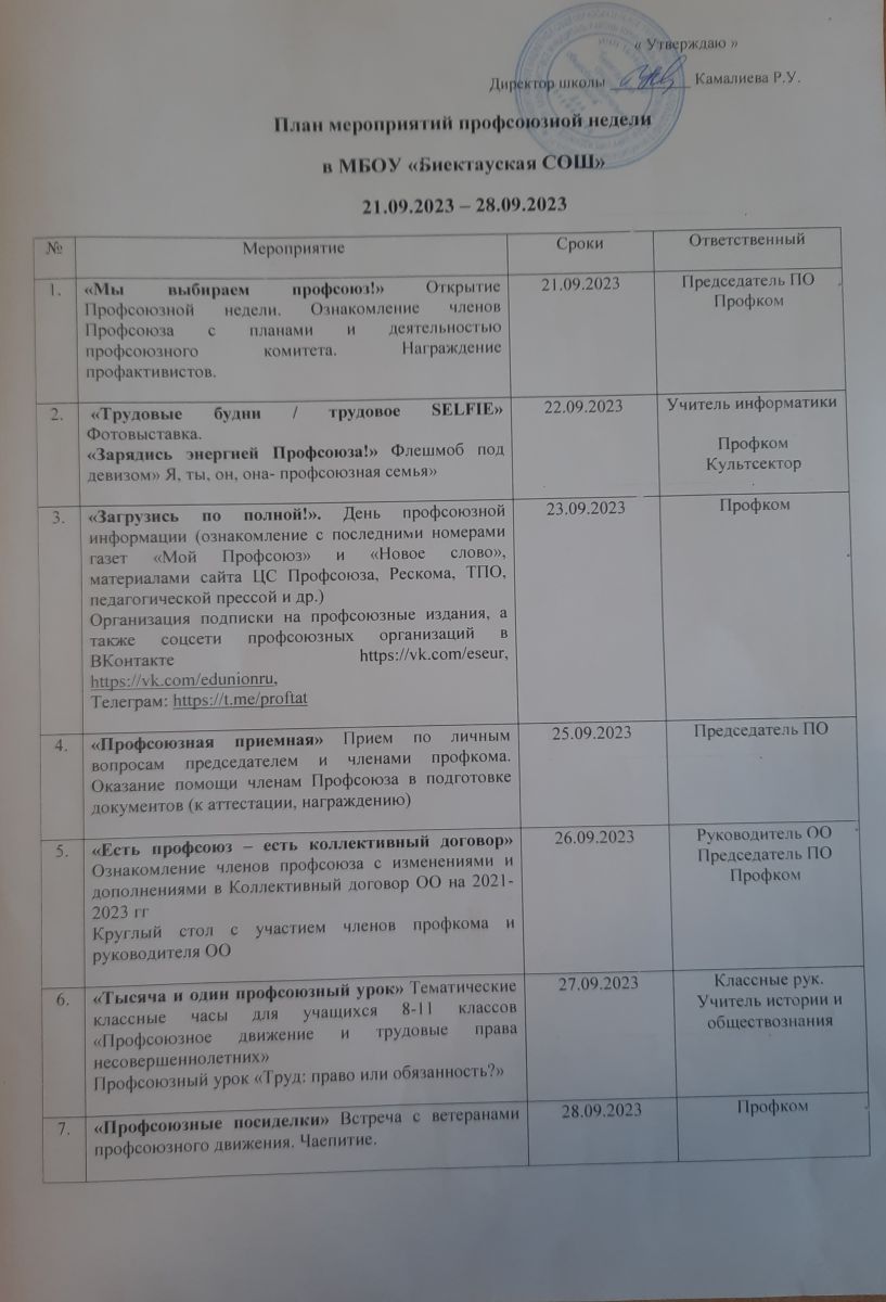 План работы первичной профсоюзной организации МБОУ "Биектауская СОШ" на 2023-2024 учебный год