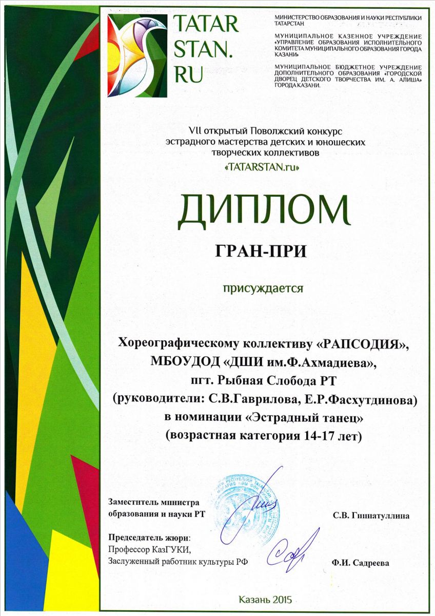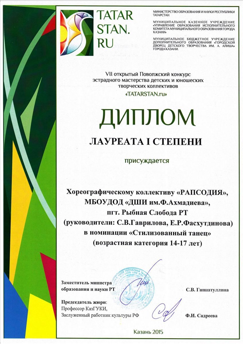 - Хореографический коллектив "Рапсодия" - Диплом Лауреата I степени VII-го открытого Поволжского конкурса эстрадного мастерства детских и юношеских творческих коллективов "TATARTAN.ru" в номинации "Стилизованный танец".