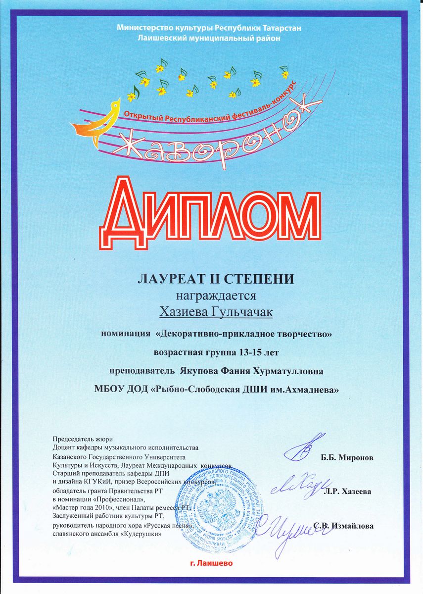 Хазиева Гульчачак - Диплом лауреата II-й степени Открытого Республиканского фестиваля-конкурса "Жаворонок" в номинации "Декоративно-прикладное творчество" (возр.группа 13-15 лет) (2015г.)