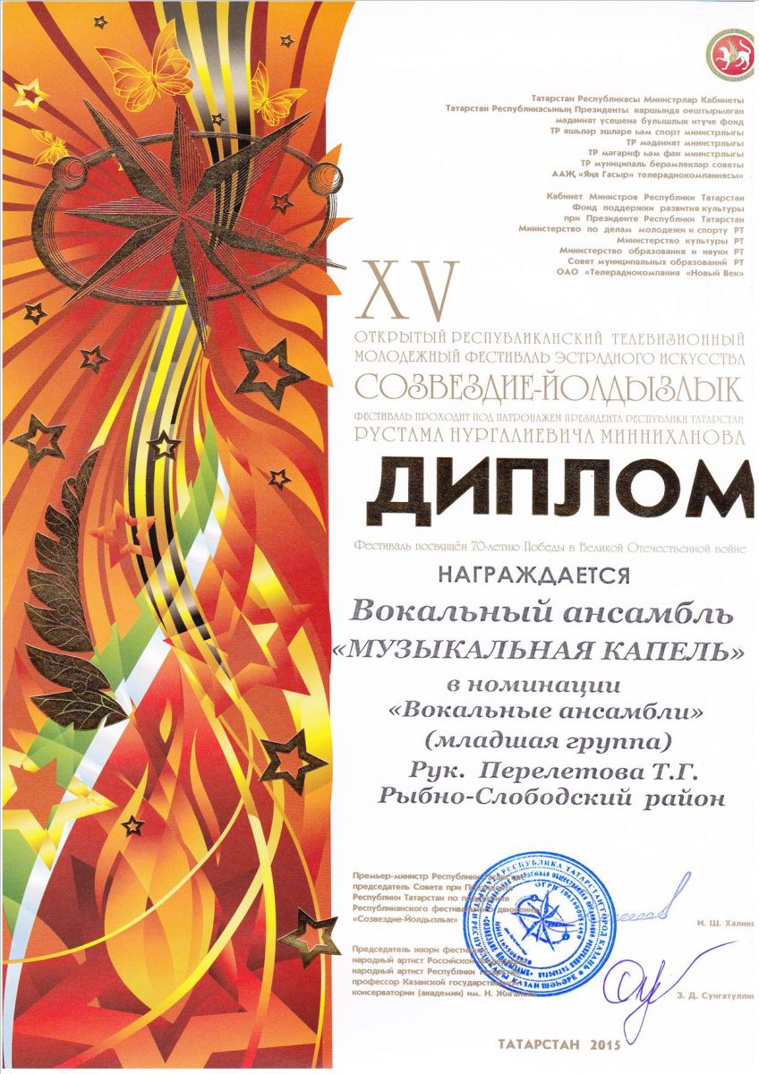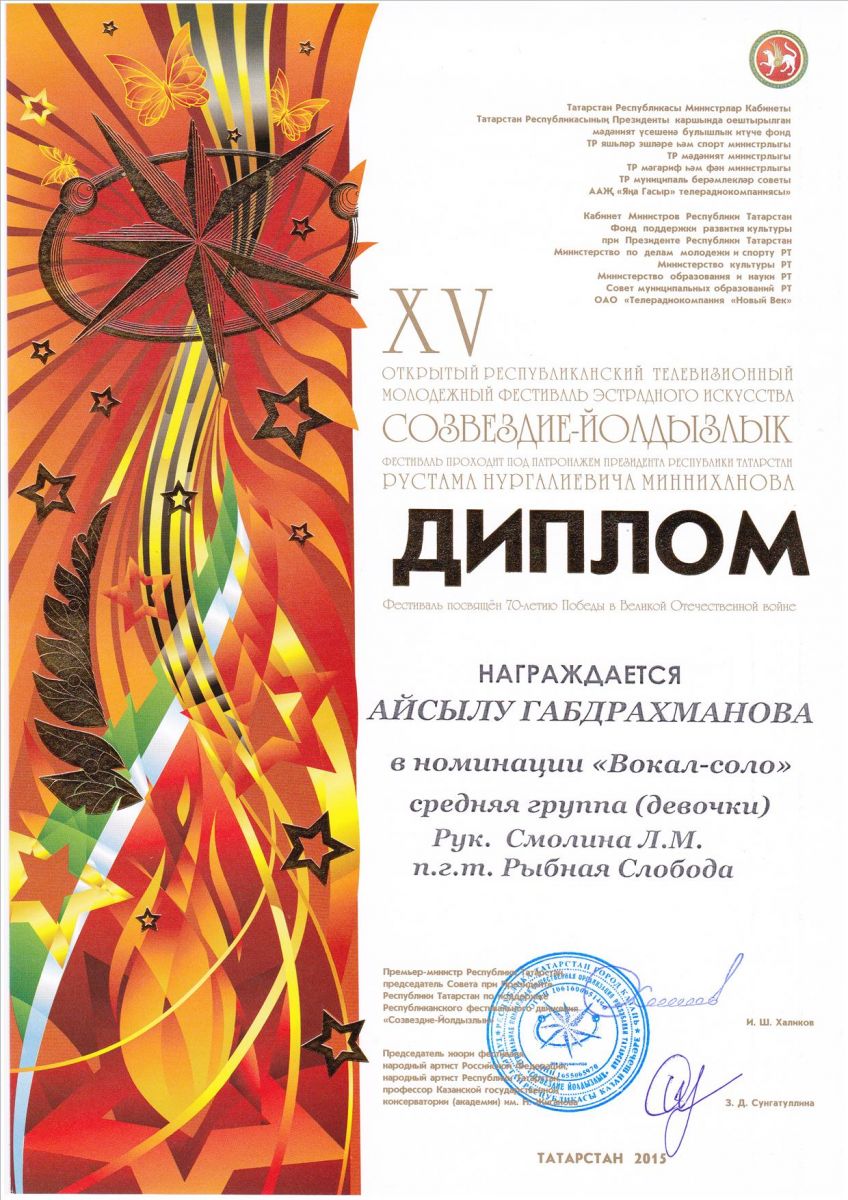 - Айсылу Габдрахманова - Диплом участника XV-го открытого Республиканского телевизионного молодежного фестиваля эстрадного искусства "Созвезие-Йолдызлык" в номинации "Вокал-соло" (средняя группа(девочки)). (2015г.)
