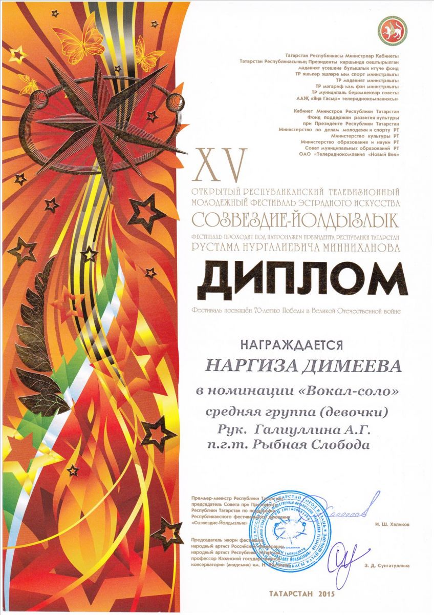 - Наргиза Димеева - Диплом участника XV-го открытого Республиканского телевизионного молодежного фестиваля эстрадного искусства "Созвезие-Йолдызлык" в номинации "Вокал-соло" (средняя группа(девочки)). (2015г.)