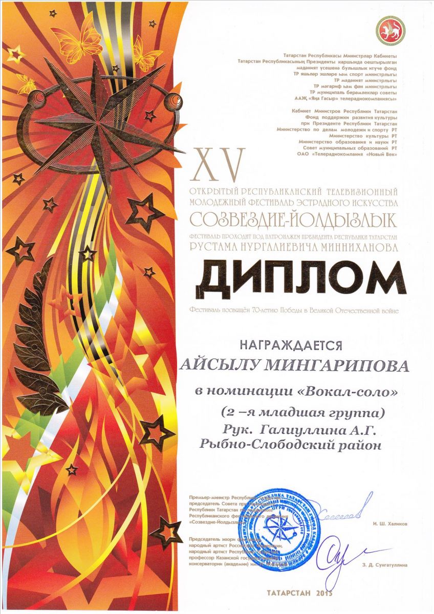 - Айсылу Мингарипова - Диплом участника XV-го открытого Республиканского телевизионного молодежного фестиваля эстрадного искусства "Созвезие-Йолдызлык" в номинации "Вокал-соло" (2-я младшая группа). (2015г.)