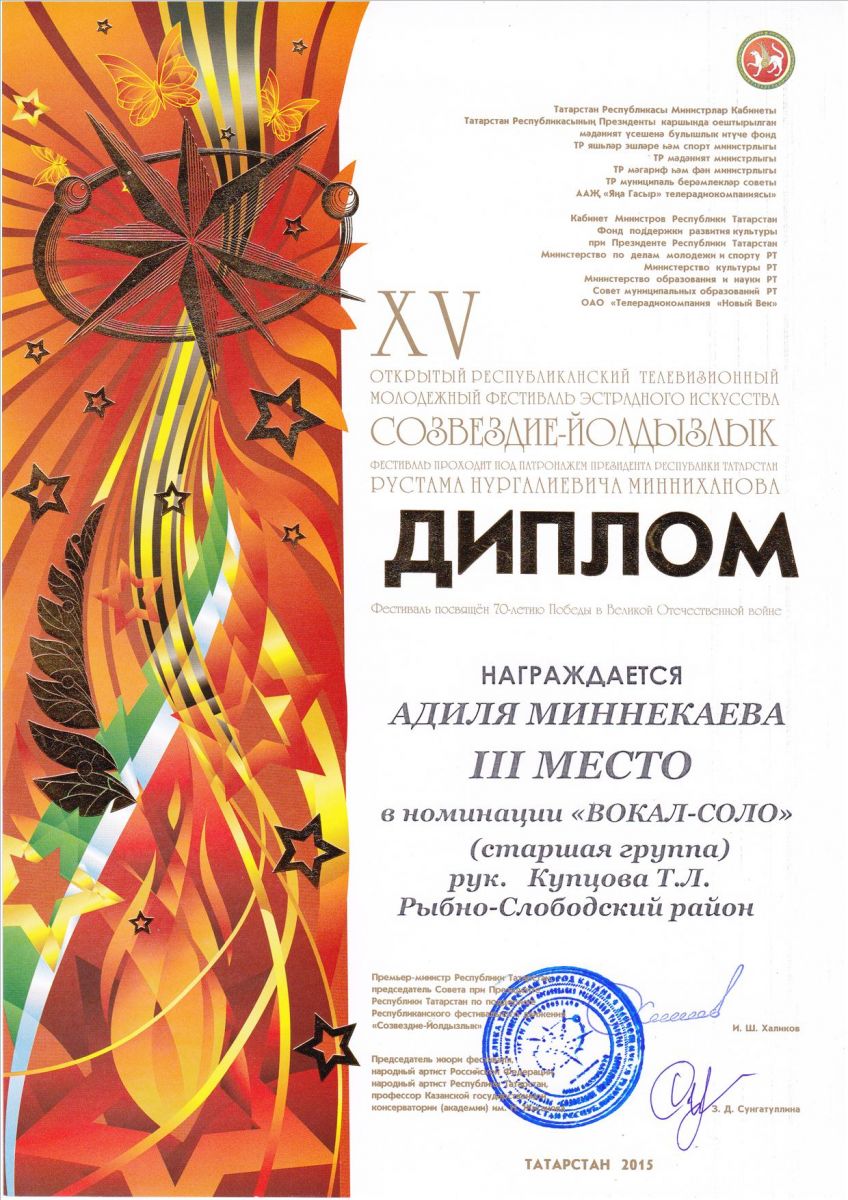 - Адиля Миннекаева - Диплом за III-е место XV-го открытого Республиканского телевизионного молодежного фестиваля эстрадного искусства "Созвезие-Йолдызлык" в номинации "Вокал-соло" (старшая группа). (2015г.)