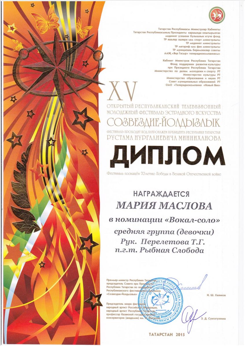 - Мария Маслова - Диплом участника XV-го открытого Республиканского телевизионного молодежного фестиваля эстрадного искусства "Созвезие-Йолдызлык" в номинации "Вокал-соло" (средняя группа(девочки)). (2015г.)