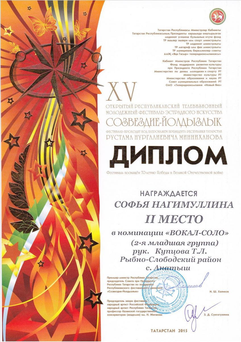 - София Нагимуллина - Диплом за II-е место XV-го открытого Республиканского телевизионного молодежного фестиваля эстрадного искусства "Созвезие-Йолдызлык" в номинации "Вокал-соло" (2-я младшая группа). (2015г.)