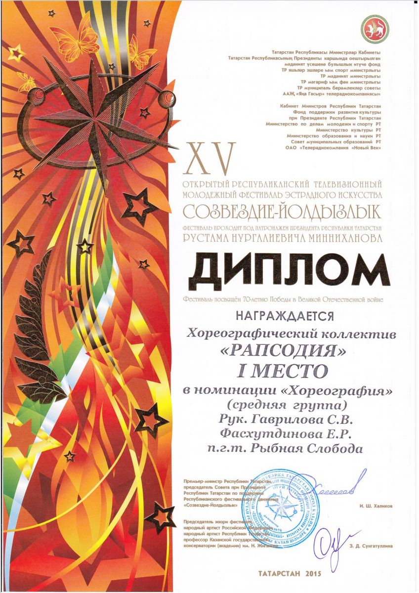 - Хореографический коллектив "Рапсодия" - Диплом Победителя (I-е место) XV-го открытого Республиканского телевизионного молодежного фестиваля эстрадного искусства "Созвезие-Йолдызлык" в номинации "Хореография" (средняя группа). Участник Гала-концерта в КРК "Пирамида" (2015г.)