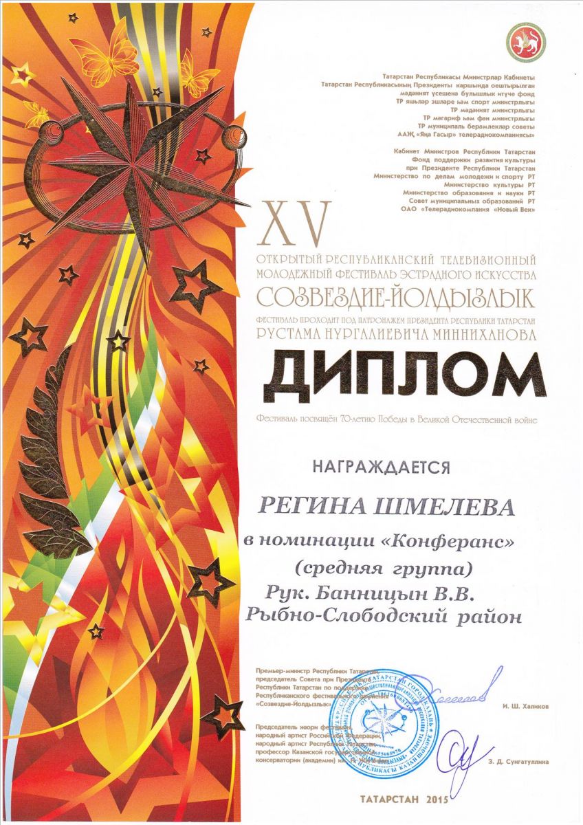 - Регина Шмелева - Диплом участника XV-го открытого Республиканского телевизионного молодежного фестиваля эстрадного искусства "Созвезие-Йолдызлык" в номинации "Конферанс" (средняя группа). (2015г.)