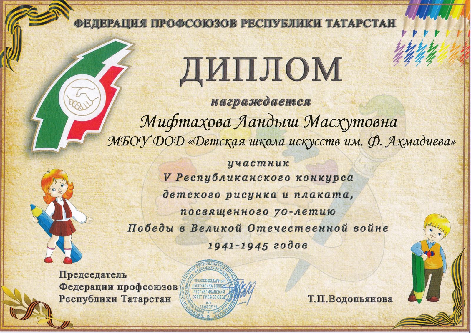 - Мифтахова Ландыш - Диплом участника V-го Республиканского конкурса детского рисунка и плаката, посвященного 70-летию Победы в Великой Отечественной 1941-1945 годов (2015г.)