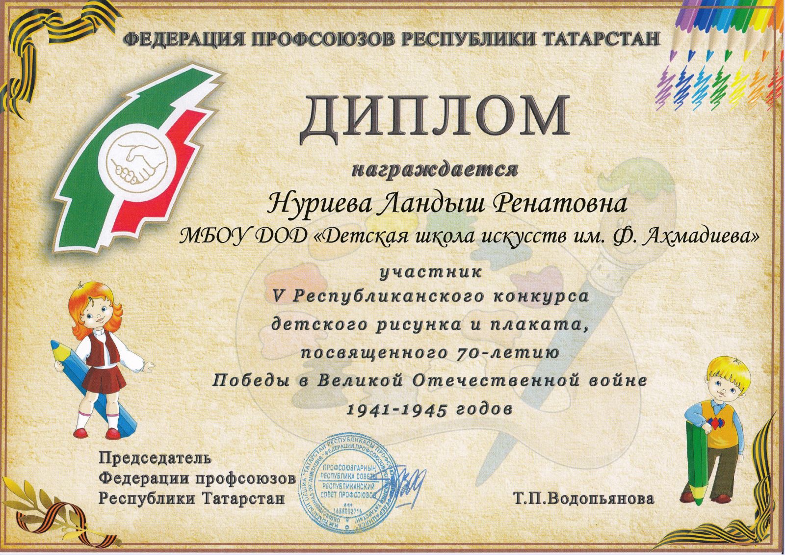 - Нуриева Ландыш - Диплом участника V-го Республиканского конкурса детского рисунка и плаката, посвященного 70-летию Победы в Великой Отечественной 1941-1945 годов (2015г.)