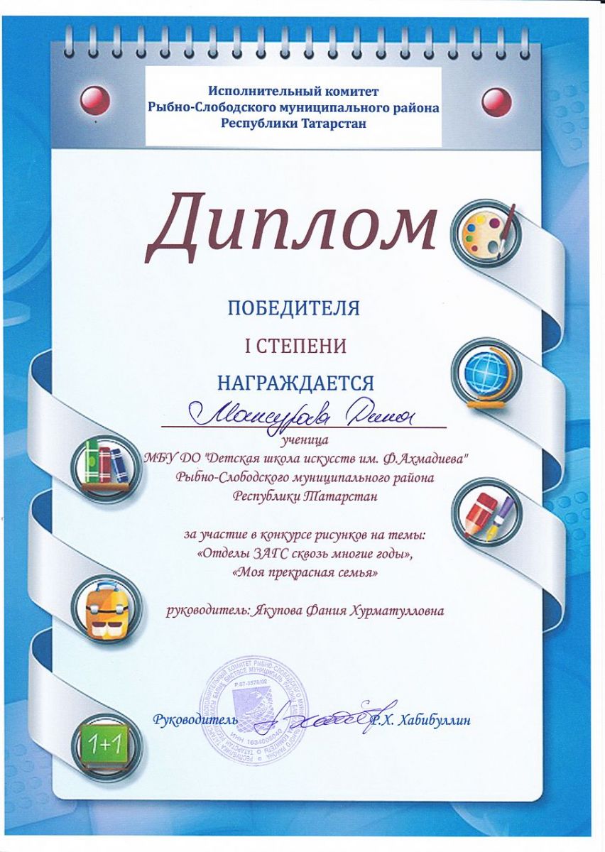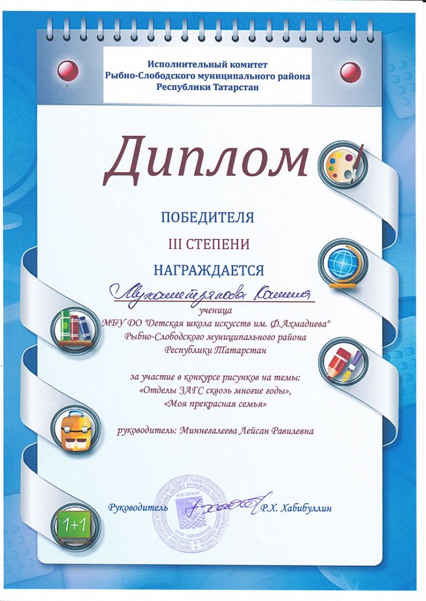 - Мифтахова Ландыш - Диплом III-й степени конкурса рисунков на темы "Моя прекрасная семья", "Отделы ЗАГС сквозь многие годы"(2016г.)