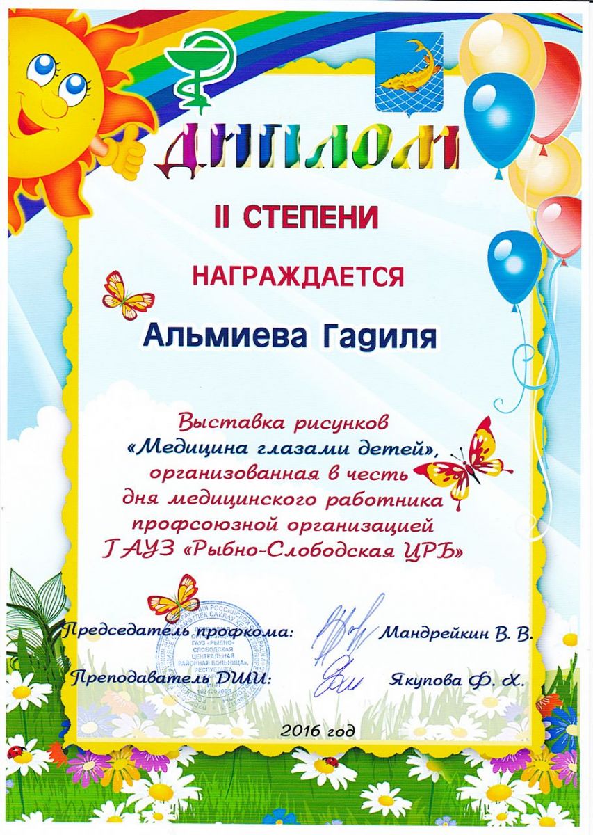 - Альмиева Гадиля - Диплом II-й степени выставки рисунков "Медицина глазами детей"(2016г.)
