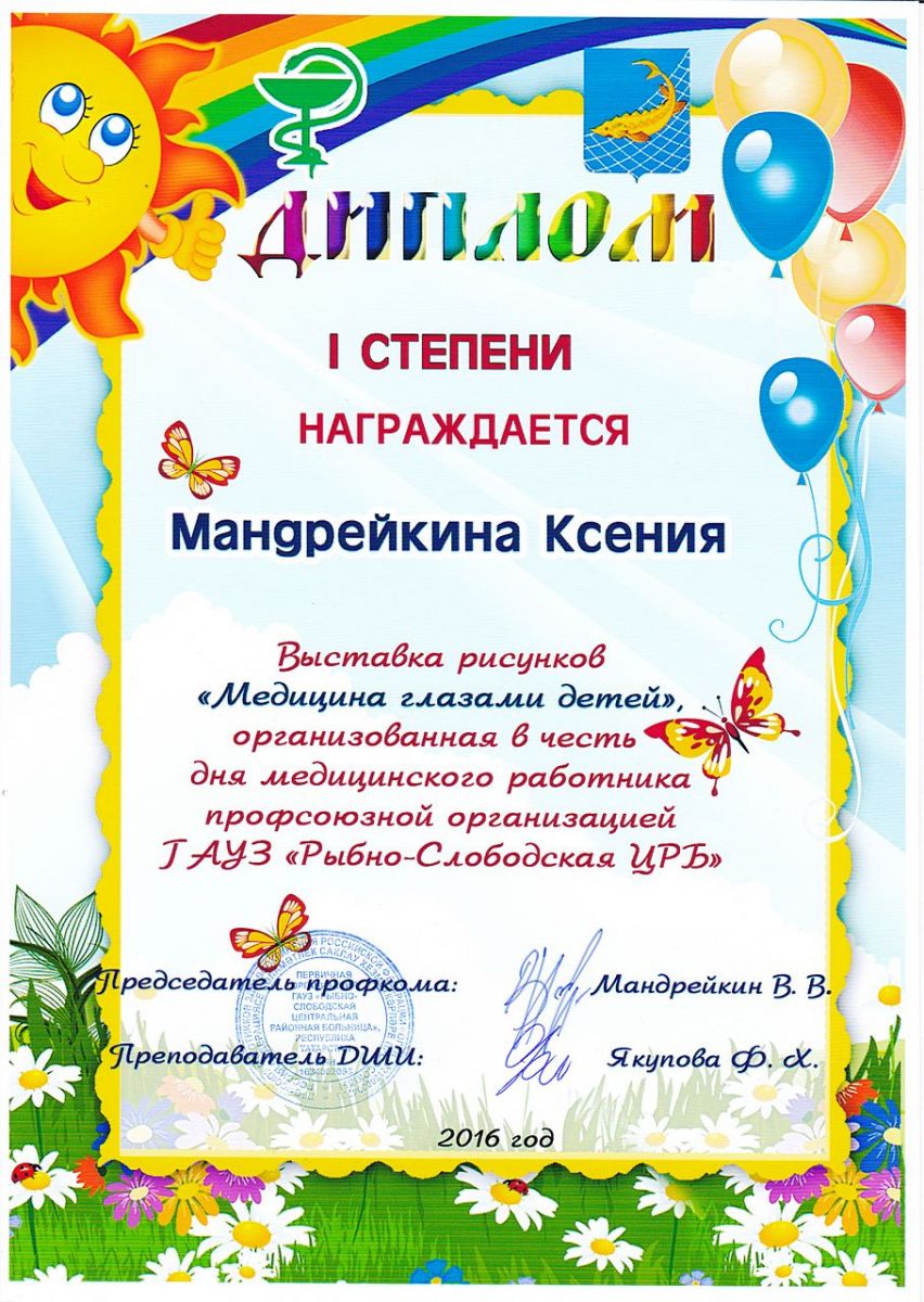 - Мандрейкина Ксения - Диплом I-й степени выставки рисунков "Медицина глазами детей"(2016г.)