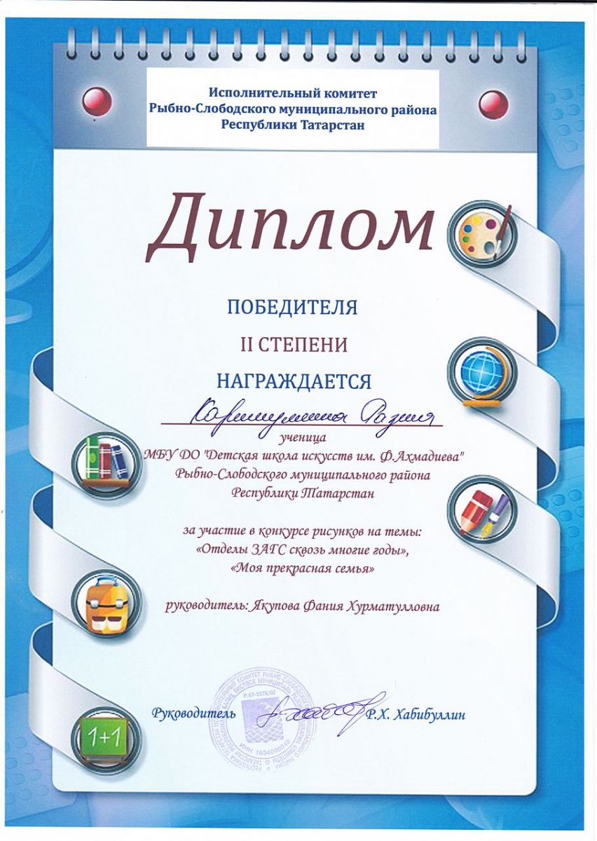 - Каримуллина Разиля - Диплом II-й степени конкурса рисунков на темы "Моя прекрасная семья", "Отделы ЗАГС сквозь многие годы"(2016г.)