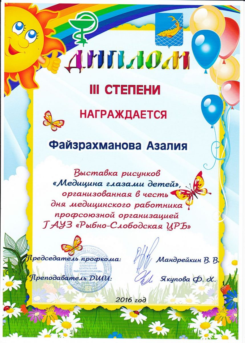 - Файзрахманова Азалия - Диплом III-й степени выставки рисунков "Медицина глазами детей"(2016г.)