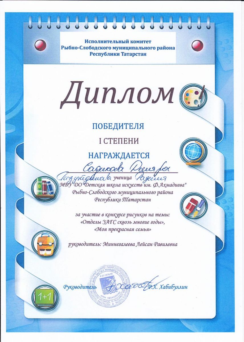 - Нуриева Ландыш - Диплом I-й степени конкурса рисунков на темы "Моя прекрасная семья", "Отделы ЗАГС сквозь многие годы"(2016г.)