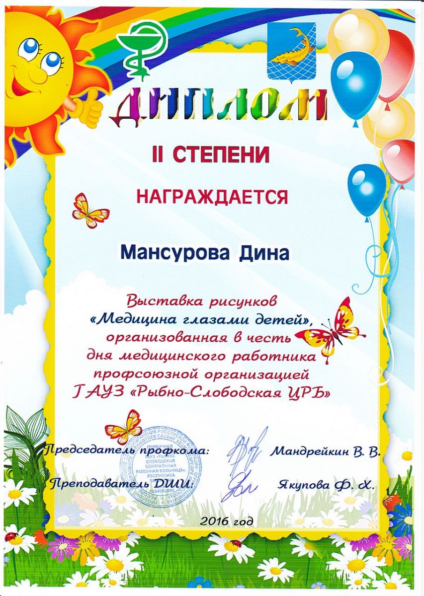- Мансурова Дина - Диплом II-й степени выставки рисунков "Медицина глазами детей"(2016г.)