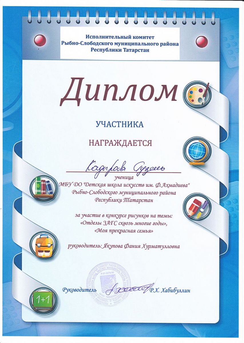 - Кадырова Гузель - Диплом участника конкурса рисунков на темы "Моя прекрасная семья", "Отделы ЗАГС сквозь многие годы"(2016г.)