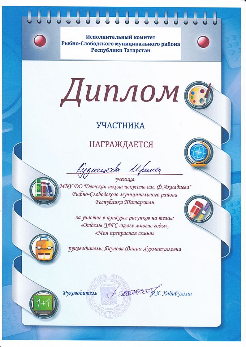 - Сафина Ильдина - Диплом участника конкурса рисунков на темы "Моя прекрасная семья", "Отделы ЗАГС сквозь многие годы"(2016г.)