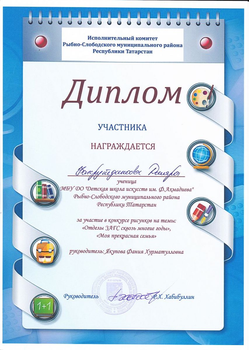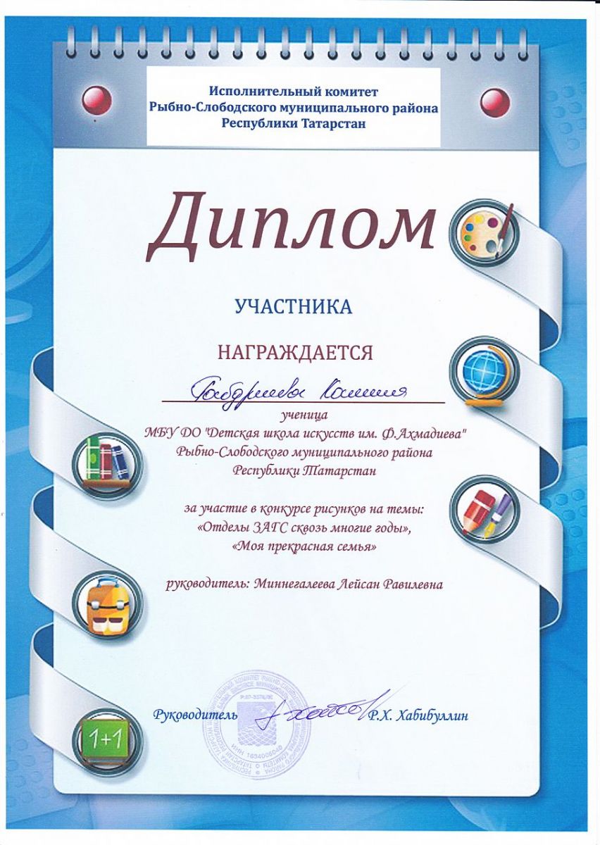 - Фахрутдинова Диляра - Диплом участника конкурса рисунков на темы "Моя прекрасная семья", "Отделы ЗАГС сквозь многие годы"(2016г.)
