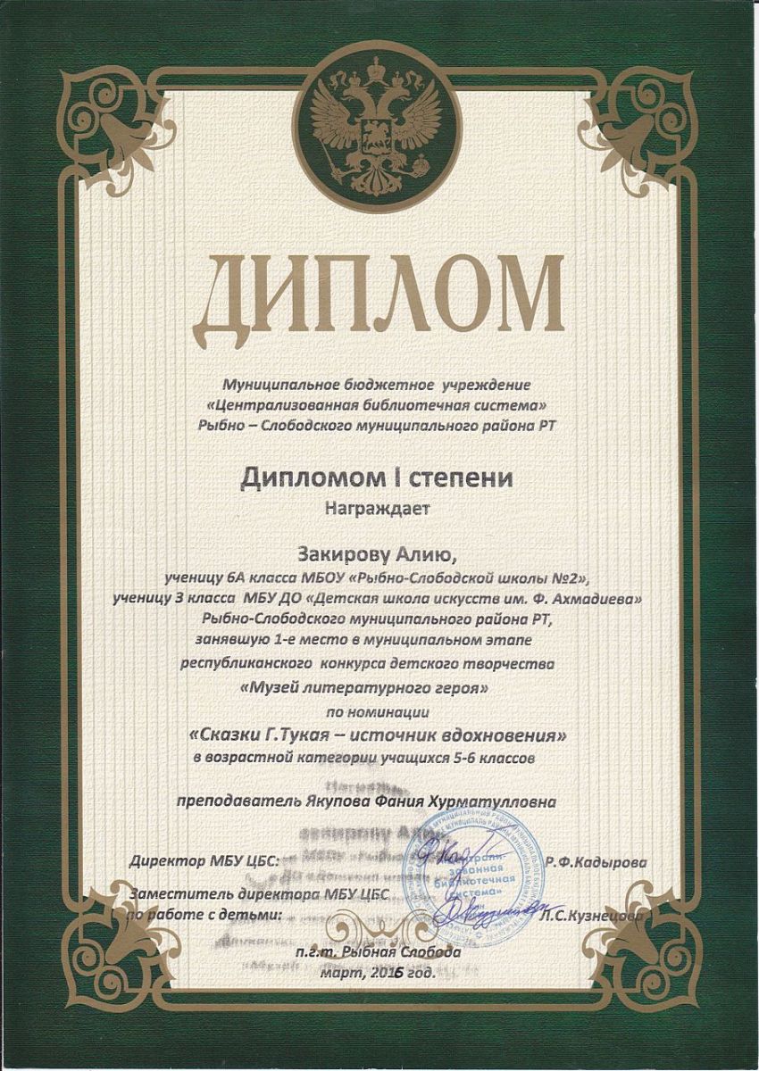 - Закирова Алия - Диплом за первое место муниципального этапа Республиканского конкурса детского творчества "Музей литературного героя" по номинации "Сказки Г.Тукая - источник вдохновения" в возрастной категории 5-6 классов (2016г.)