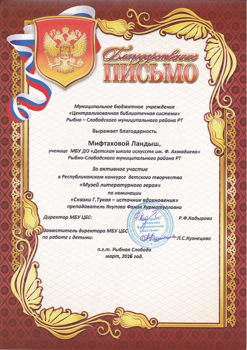 - Мифтахова Ландыш - Благодарственное письмо за активное участие в Республиканском конкурсе детского творчества "Музей литературного героя" по номинации "Сказки Г.Тукая - источник вдохновения"(2016г.)