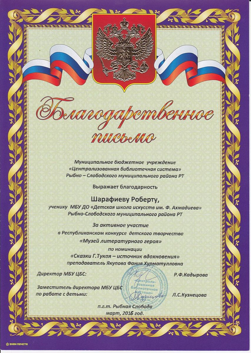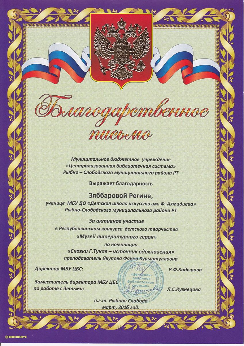- Зяббарова Регина - Благодарственное письмо за активное участие в Республиканском конкурсе детского творчества "Музей литературного героя" по номинации "Сказки Г.Тукая - источник вдохновения"(2016г.)