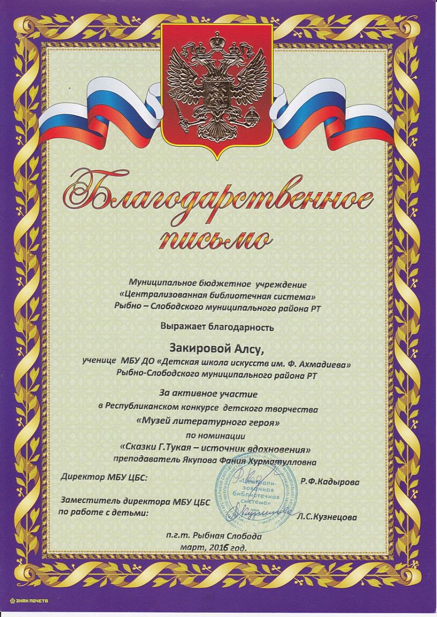 - Закирова Алсу - Благодарственное письмо за активное участие в Республиканском конкурсе детского творчества "Музей литературного героя" по номинации "Сказки Г.Тукая - источник вдохновения"(2016г.)