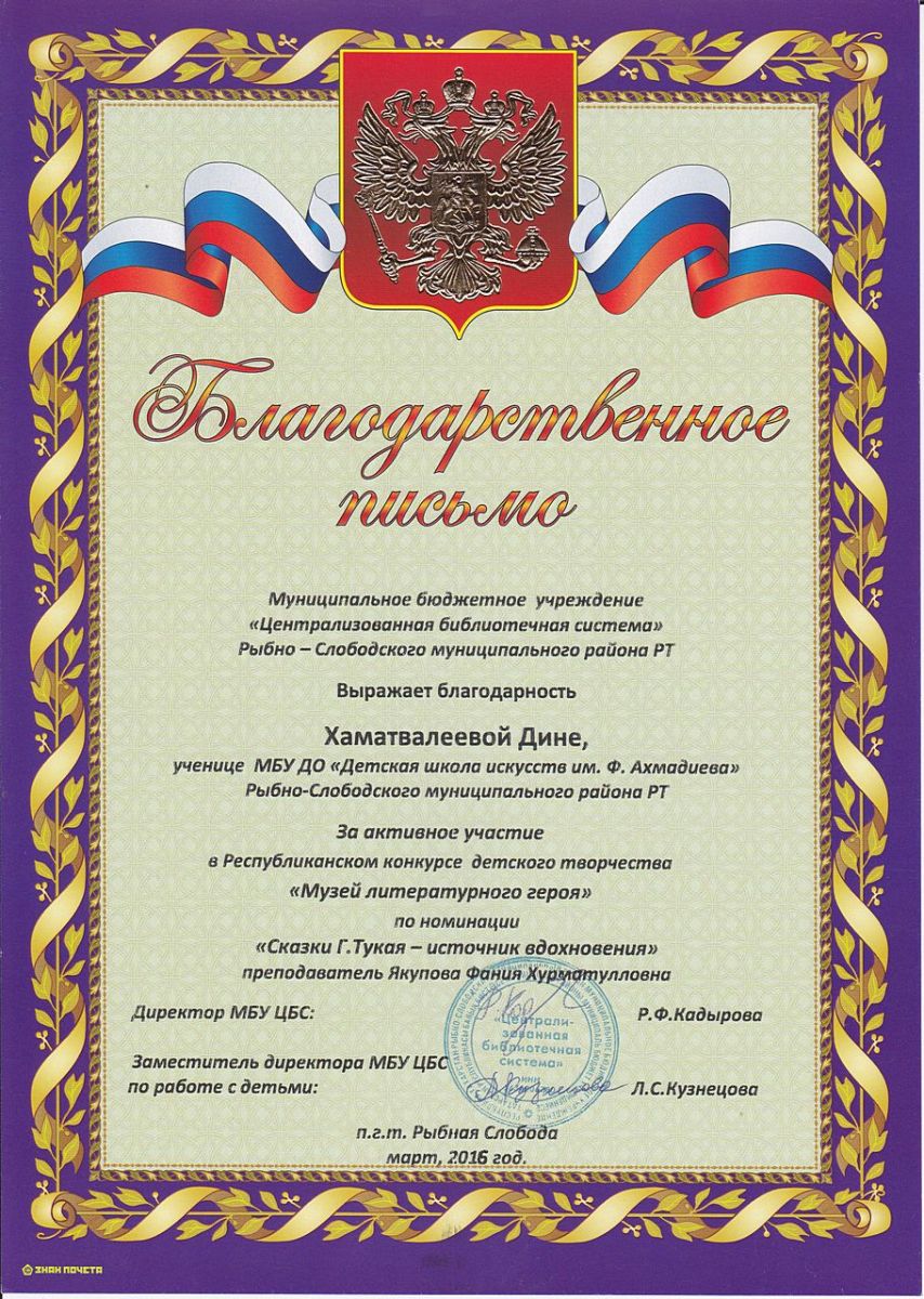 - Хаматвалеева Дина - Благодарственное письмо за активное участие в Республиканском конкурсе детского творчества "Музей литературного героя" по номинации "Сказки Г.Тукая - источник вдохновения"(2016г.)