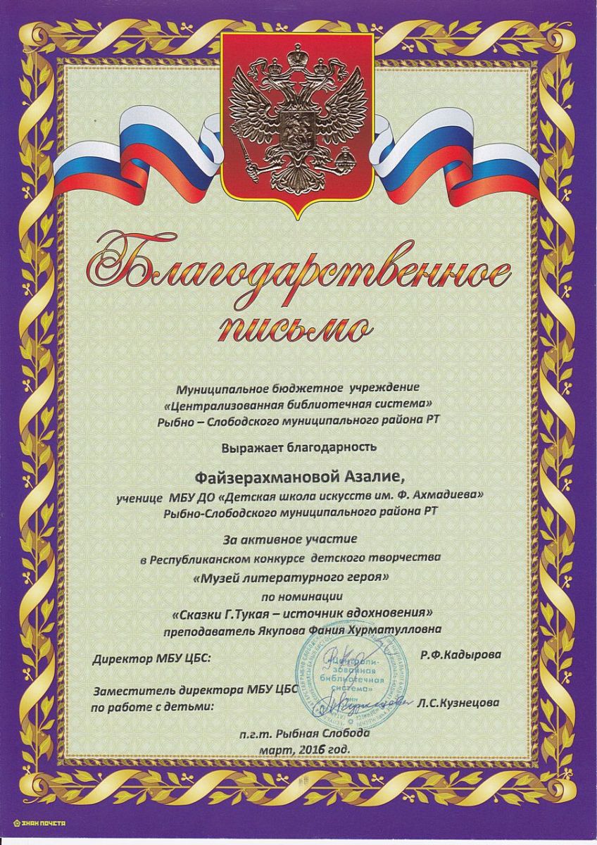 - Файзерахманова Азалия - Благодарственное письмо за активное участие в Республиканском конкурсе детского творчества "Музей литературного героя" по номинации "Сказки Г.Тукая - источник вдохновения"(2016г.)