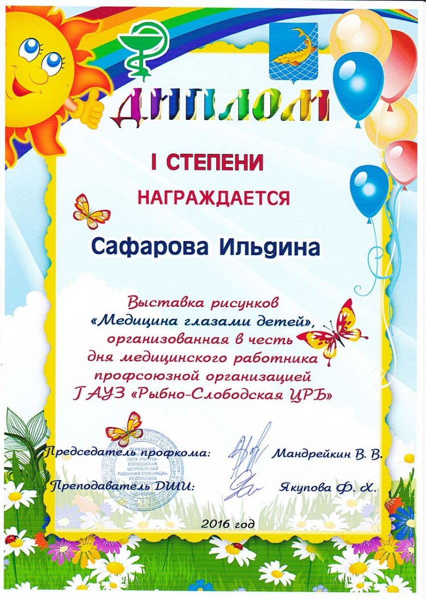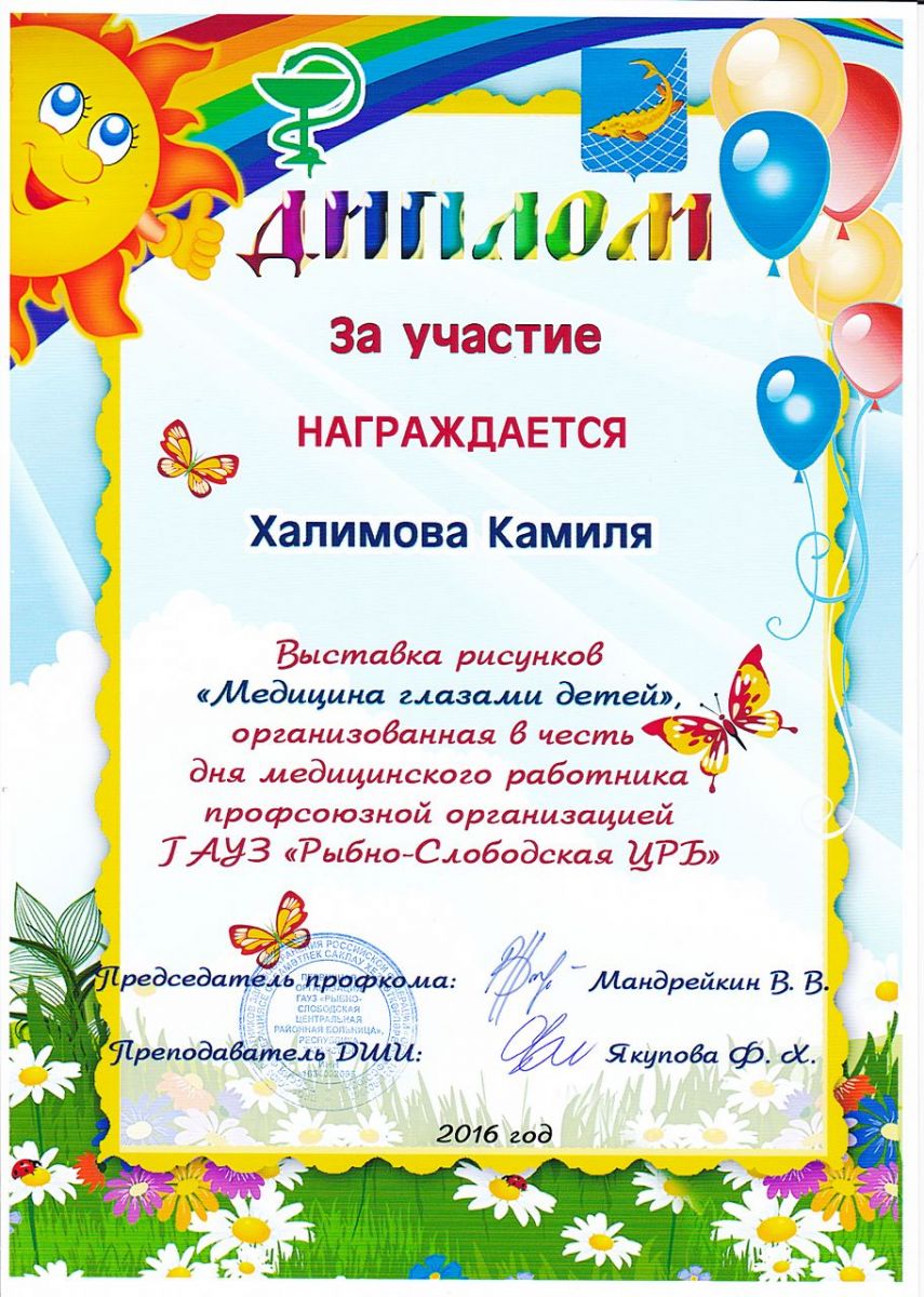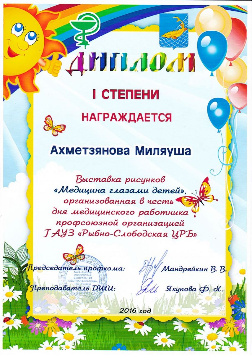 - Мифтахова Ландыш - Диплом за участие в выставке рисунков "Медицина глазами детей"(2016г.)