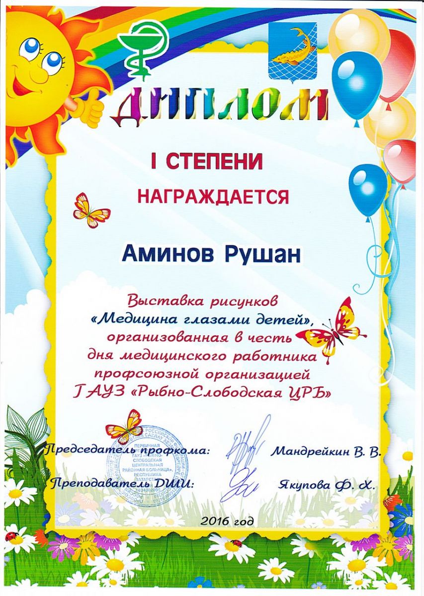 - Аминов Рушан - Диплом I-й степени выставки рисунков "Медицина глазами детей"(2016г.)