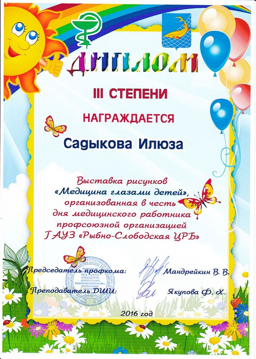 - Садыкова Илюза - Диплом III-й степени выставки рисунков "Медицина глазами детей"(2016г.)