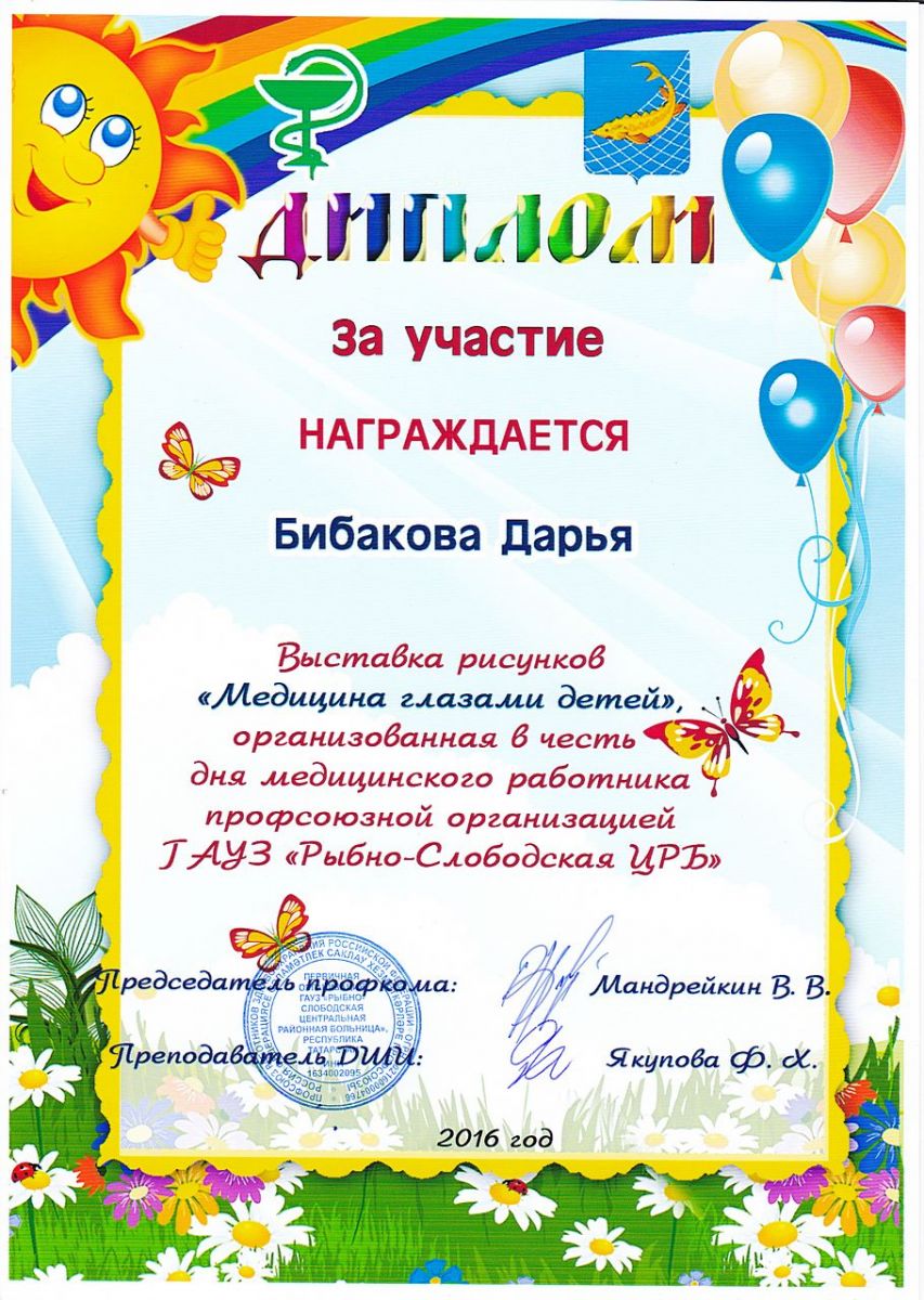 - Бибакова Дарья - Диплом за участие в выставке рисунков "Медицина глазами детей"(2016г.)