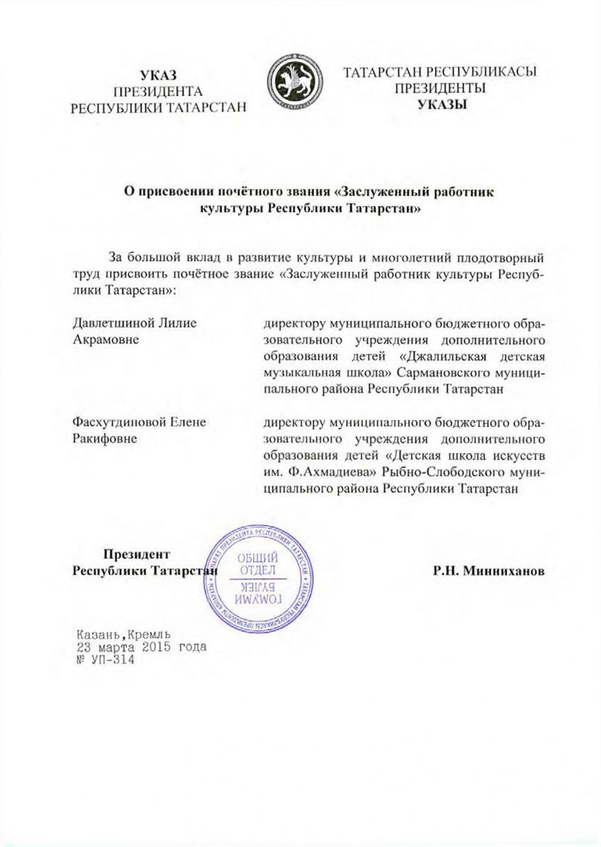 Фасхутдинова Елена Ракифовна - Присвоение звания "Заслуженный работник культуры Республики Татарстан" (март 2015г.)