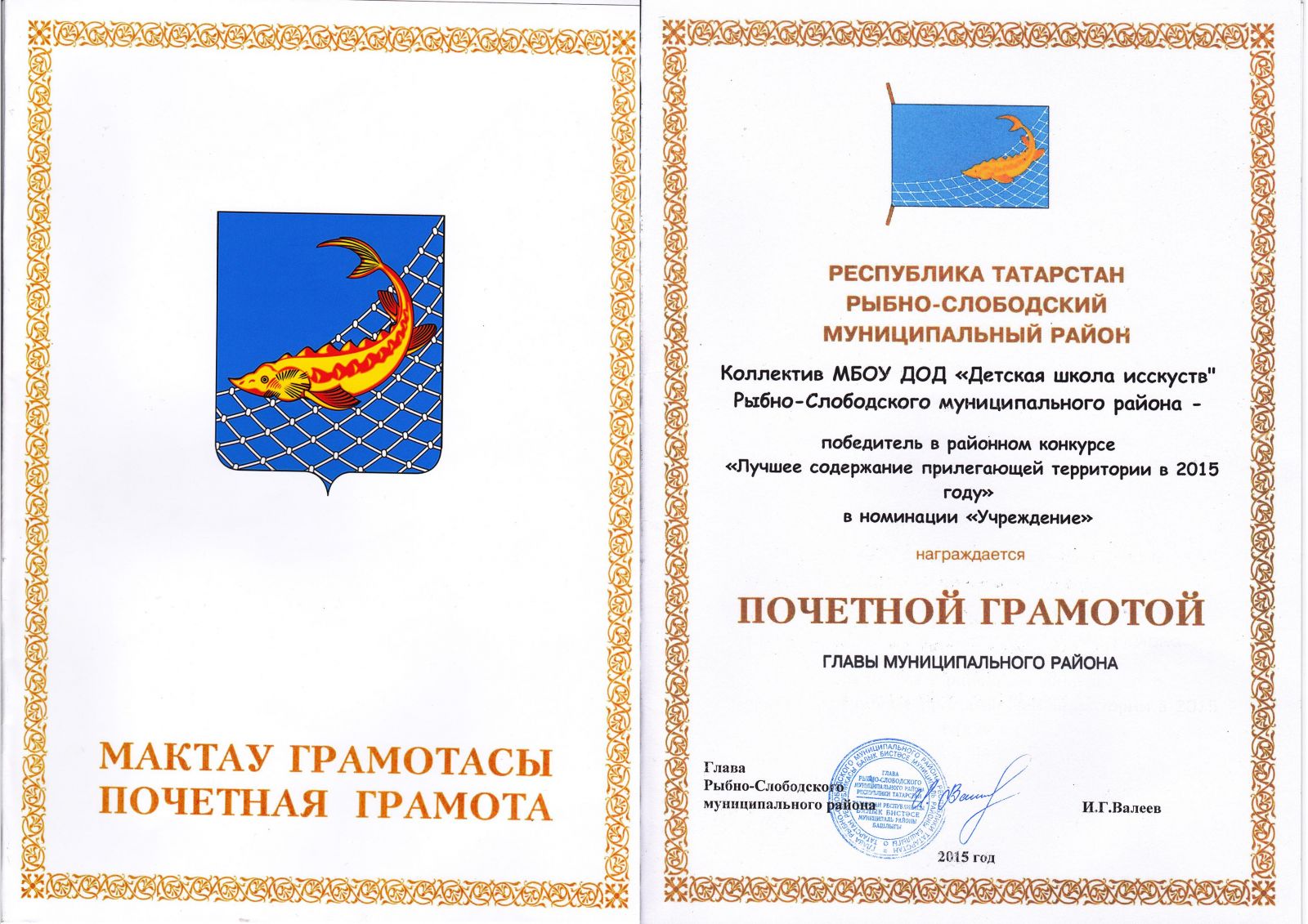 Педагогический коллектив - Почетная грамота Главы Рыбно-Слободского муниципального района за победу в районном конкурсе "Лучшее содержание прилегающей территории в 2015 году" (2015г.)