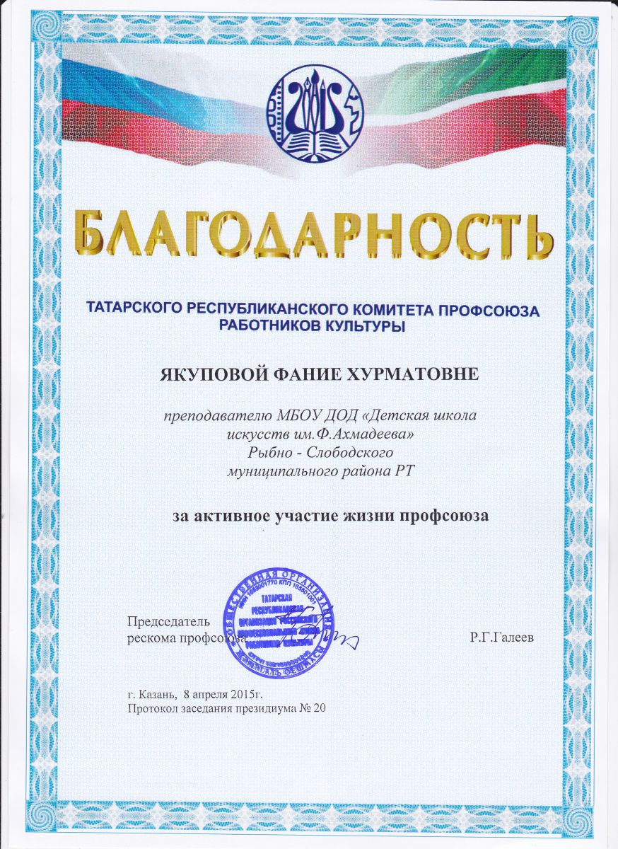 - Якупова Фания Хурматулловна - Благодарственное письмо Татарского Республиканского комитета Профсоюза работников культуры (апрель 2015г.)