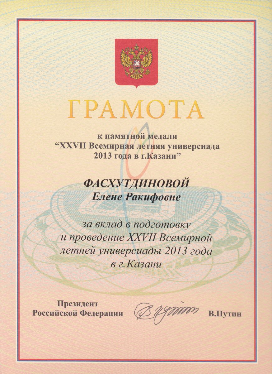 - Фасхутдинова Елена Ракифовна - Медаль "XXVII Всемирная летняя универсиада 2013 года в г.Казани" за вклад в подготовку и проведение XXVII Всемирной летней универсиады 2013 года в г.Казани (Дата награждения - март 2015г.)