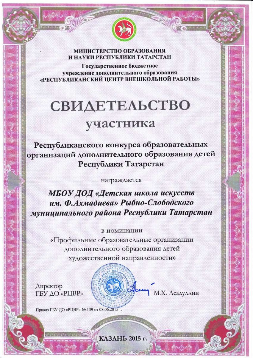 Педагогический коллектив - Свидетельство участника Республиканского конкурса образовательных организаций дополнительного образования детей в номинации "Профильные образовательные организации дополнительного образования детей художественной направленности" (2015г.)
