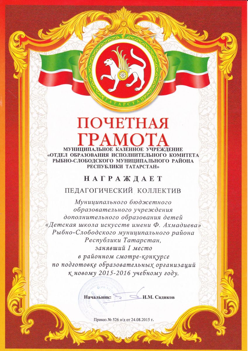 Педагогический коллектив - Почетная грамота МКУ "Отдел образования Исполнительного комитета Рыбно-Слободского муниципального района Республики Татарстан" за I-е место в районном смотре-конкурсе по подготовке образовательных организаций к новому 2015-2016 учебному году" (2015г.)