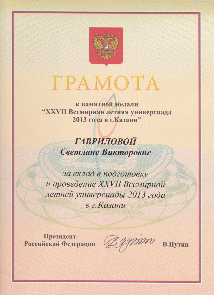 Гаврилова Светлана Викторовна - Медаль "XXVII Всемирная летняя универсиада 2013 года в г.Казани" за вклад в подготовку и проведение XXVII Всемирной летней универсиады 2013 года в г.Казани (Дата награждения - март 2015г.)