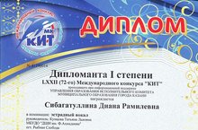 23-24 ноября, в городе Казани, при информационной поддержке Управления образования Исполнительного комитета муниципального образования города Казани прошел 72-ой Международный конкурс "КИТ" (культура * искусство * творчество). В номинации "Эстрадный вокал. Соло. 8-10 лет" - Дипломантом I-ой степени стала Сибагатуллина Диана (руководитель: Купцова Т.Л.)