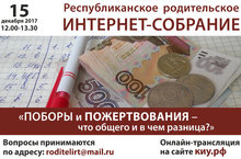 15 декабря 2017г. с 12.00 до 13.30 состоится Республиканское родительское интернет-собрание "Поборы и пожертвования - что общего и в чём разница?" Онлайн-трансляция на сайте http://киу.рф Вопросы принимаются по адресу roditelirt@!mail.ru