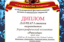С 1 по 3 ноября в Казани прошел VI Международный фестиваль-конкурс детского и юношеского творчества «Содружество талантов». Наша школа представила на конкурс хореографический коллектив "Рапсодия" в номинации "Эстрадный танец" и Нагимуллину Софию в номинации "Зстрадный вокал. Соло". Нагимуллина София получила диплом Лауреата III степени (Руководитель: Купцова Татьяна Львовна), а группа "Рапсодия" получила 1 место став Лауреатом I степени (Руководители:Гаврилова Светлана Викторовна, Фасхутдинова Елена Ракифовна) Поздравляем ребят и их педагогов с победой!
