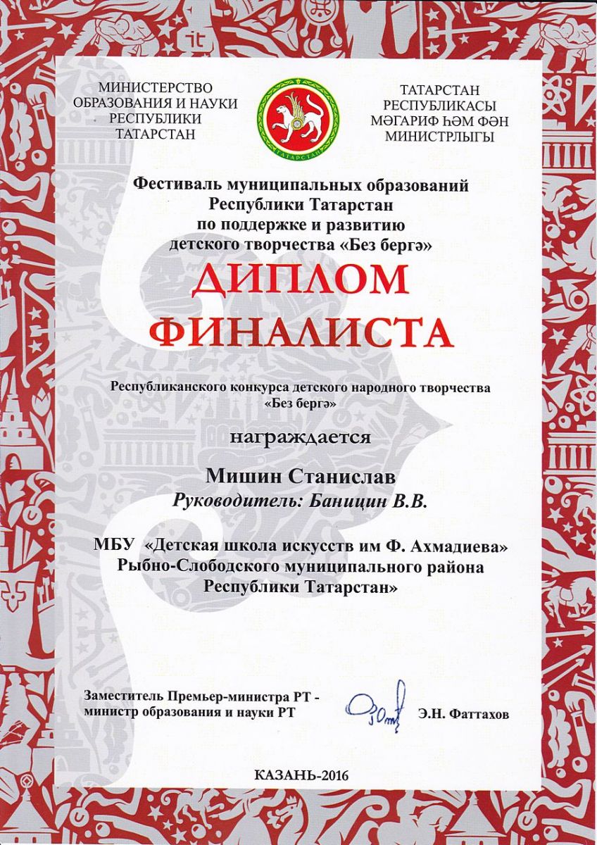 - Станислав Мишин - Диплом финалиста Фестиваля муниципальных образований Республики Татарстан по поддержке и развитию десткого творчества "Без берге" (2016г.)