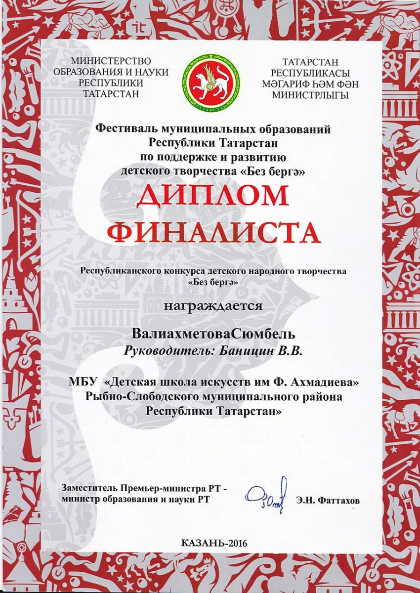 - Сюмбель Валиахметова - Диплом финалиста Фестиваля муниципальных образований Республики Татарстан по поддержке и развитию десткого творчества "Без берге" (2016г.)